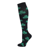 Värikkäät tukisukat, joissa apilan kuvioita.